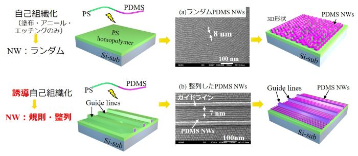ドット間隔10 nm×7.5 nmのドット列および幅10 nm以下のブロックコポリマーナノワイヤを形成しました。