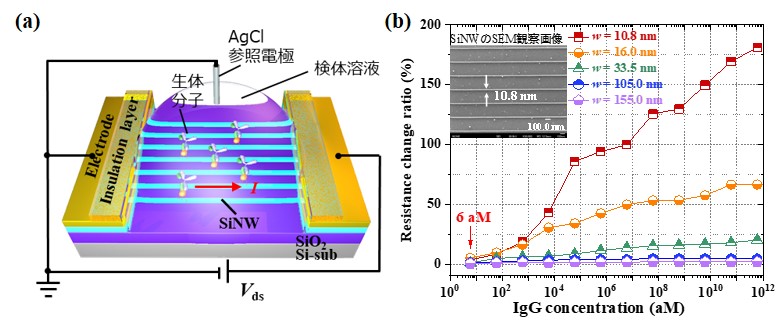 SiNWの微細化と構造最適化により、サブ10 aM(1 aM = 10^-18 mol/L)という超低濃度検出に成功しています。